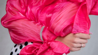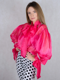Fantazyjny fason bluzki z niestandardowymi rękawami, wykończonymi mankietami, wiązanymi na kokardy. Bluzka wykonana jest z lekko przezroczystej tkaniny o nazwie organdyna. Dekolt w serek pięknie odrabia wielka kokarda przy szyi. Elementami ozdobnymi są błyszczące lamówki przy mankietach oraz z tyłu na szyi.