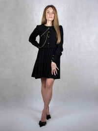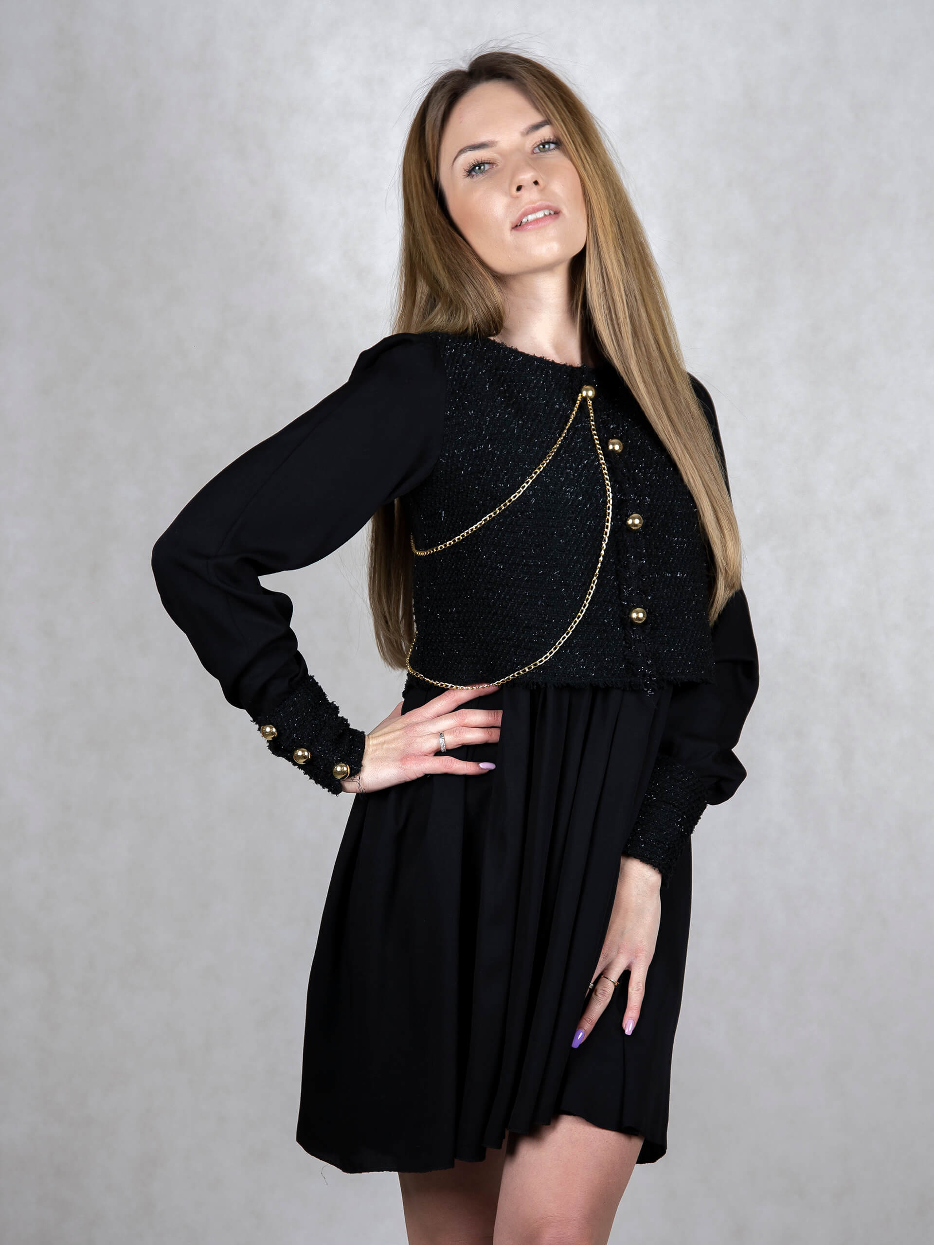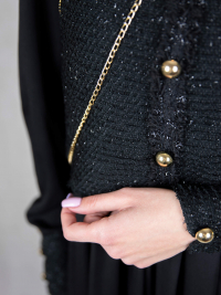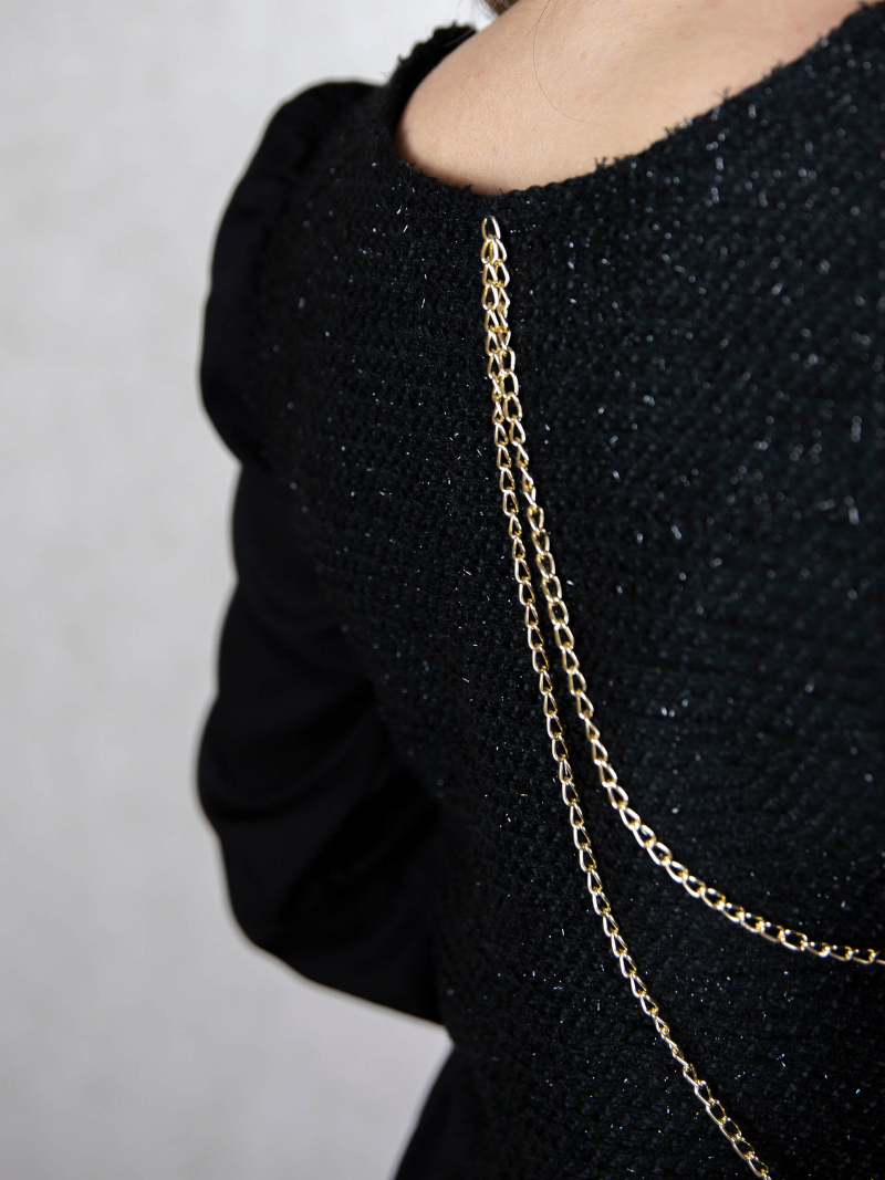 Dwuczęściowy komplet, składający się z lekkiej halki, którą można nosić również jako sukienkę i bluzki wykonanej z czarnego, miękkiego tweedu oraz rękawów wykonanych z wiskozy. Szerokie mankiety ozdobione złotymi guzikami, nawiązują do tweedowego przodu bluzki. Zloty łańcuszek nadaje całości oryginalności.