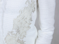 Elegancki komplet wykonany z miękkiego tweedu w kolorze bieli. Żakiet o kroju pudełkowym wykończony ręcznie wykonaną lamówką. Przód zapinany na haftki. Żakiet bez podszewki. Szwy wewnętrzne obszyte elegancką lamówką w kolorze bieli. Komplet wyszyty jest bogato zdobionymi aplikacjami co dodaje niepowtarzalności i oryginalnego charakteru. Spódnica o klasym kroju idealnie komponuje się z żakietem. Zapinana z boku na zamek kryty. Spódnica na podszewce.