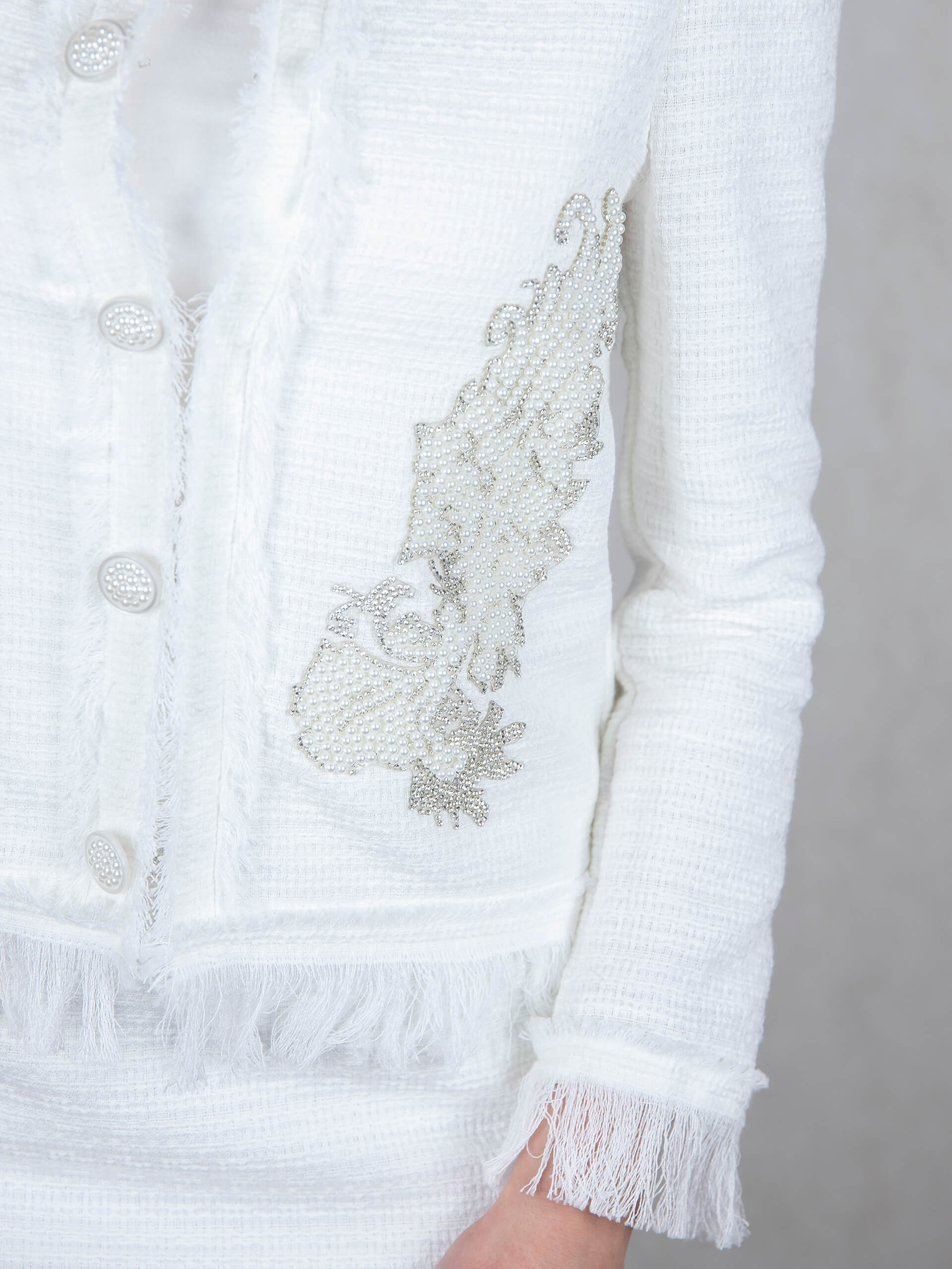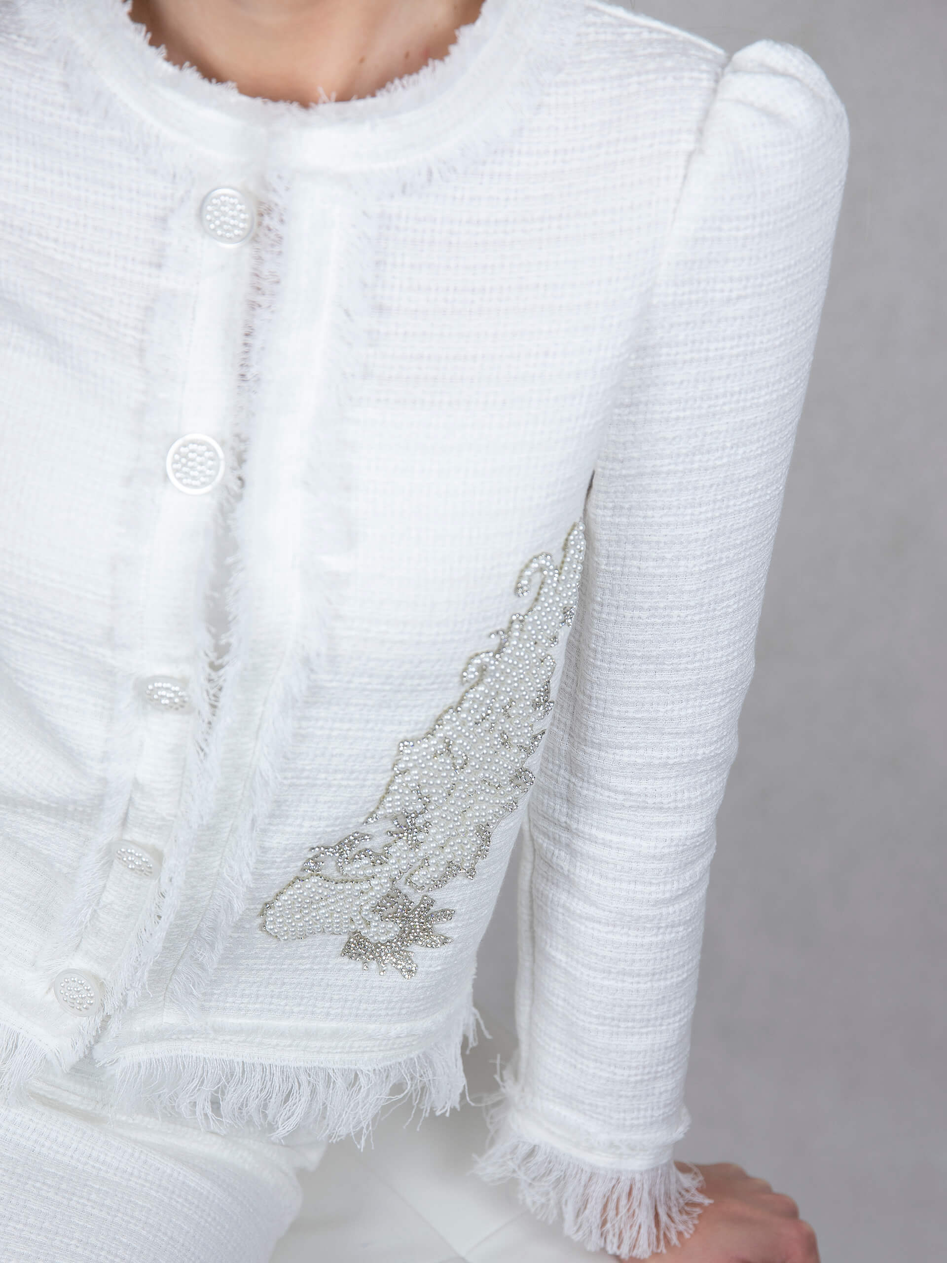 Elegancki komplet wykonany z miękkiego tweedu w kolorze bieli. Żakiet o kroju pudełkowym wykończony ręcznie wykonaną lamówką. Przód zapinany na haftki. Żakiet bez podszewki. Szwy wewnętrzne obszyte elegancką lamówką w kolorze bieli. Komplet wyszyty jest bogato zdobionymi aplikacjami co dodaje niepowtarzalności i oryginalnego charakteru. Spódnica o klasym kroju idealnie komponuje się z żakietem. Zapinana z boku na zamek kryty. Spódnica na podszewce.