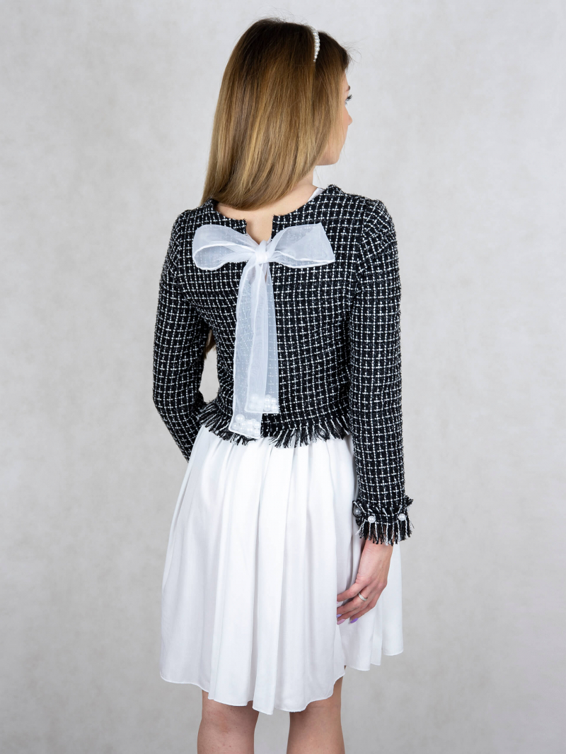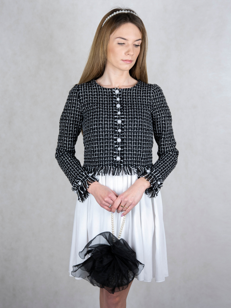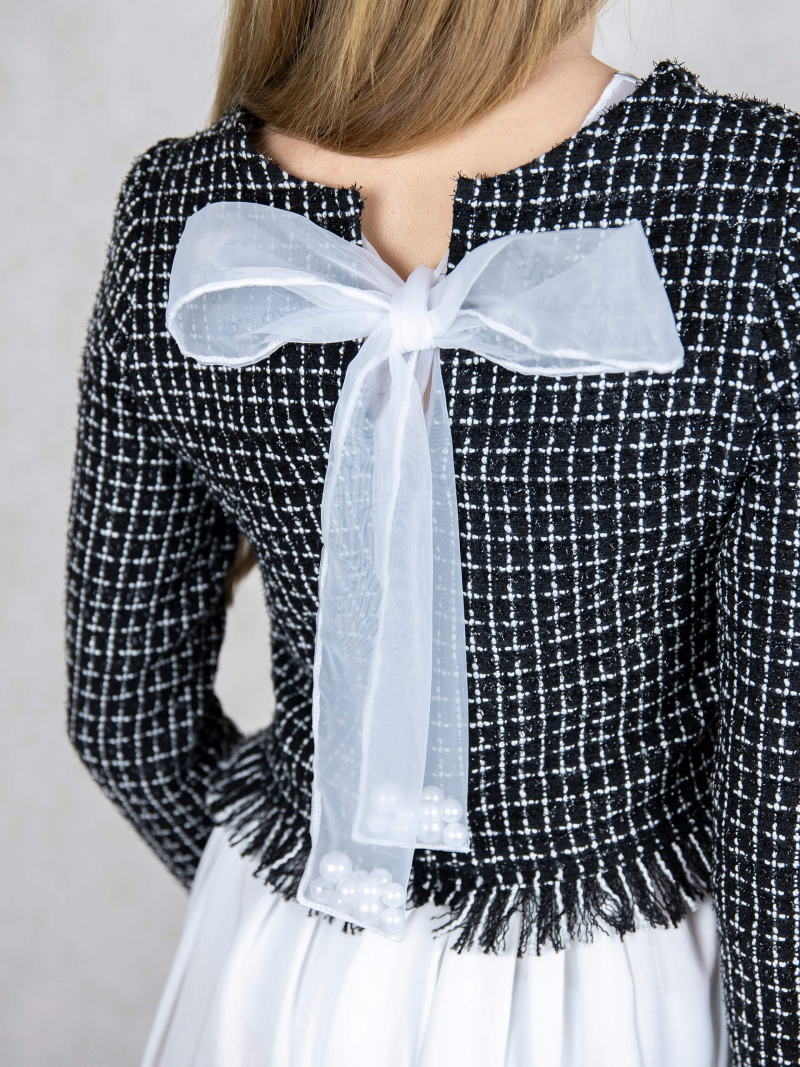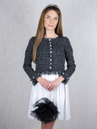 Dwuczęściowy komplet, składający się z lekkiej halki oraz bluzki tweedowej. Kunsztem całego projektu jest ozdobna kokarda z tylu bluzki z zaszytymi w środku perłami. Dzięki niej możemy regulować szerokość pleców. Przód ozdabia ręcznie wykonana taśma z tkaniny tweedowej, na którą naszyte są ręcznie perły w dwóch rozmiarach. Taki motyw zdobniczy znajduję się również na rękawach. Całość o eleganckim i wyrafinowanym smaku.