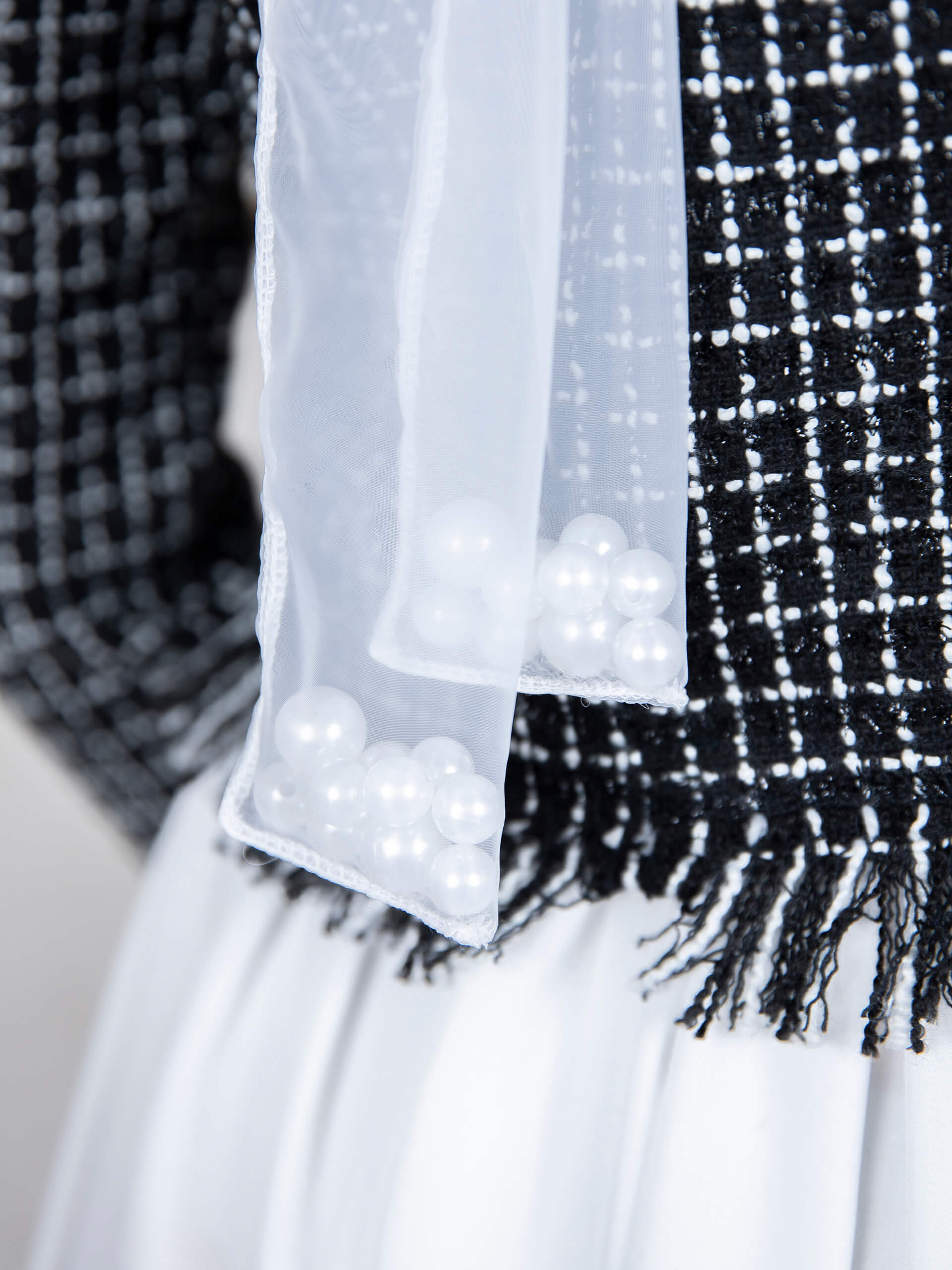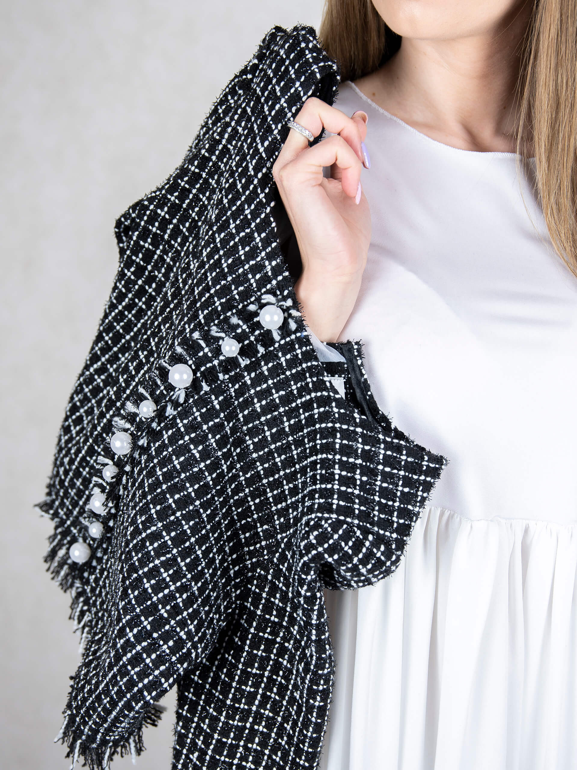 Dwuczęściowy komplet, składający się z lekkiej halki oraz bluzki tweedowej. Kunsztem całego projektu jest ozdobna kokarda z tylu bluzki z zaszytymi w środku perłami. Dzięki niej możemy regulować szerokość pleców. Przód ozdabia ręcznie wykonana taśma z tkaniny tweedowej, na którą naszyte są ręcznie perły w dwóch rozmiarach. Taki motyw zdobniczy znajduję się również na rękawach. Całość o eleganckim i wyrafinowanym smaku.
