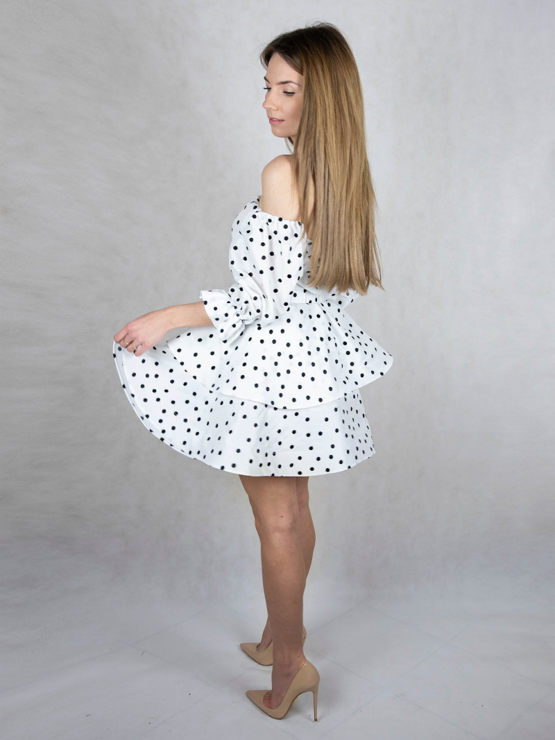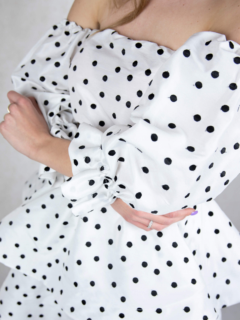 Komplet wykonany z tkaniny o nazwie tafta w haftowane czarne groszki. Składa się z topu, który dopasowuje się do ciała za pomocą wszytej gumki, spódniczki z dwóch falban podszytych krynoliną oraz bufiastych rękawów. Można go nosić na dwa sposoby. Z rękawami lub bez. Idealny na letnie dni. Możemy go stylizować z obuwiem zarówno sportowym jak i eleganckim.