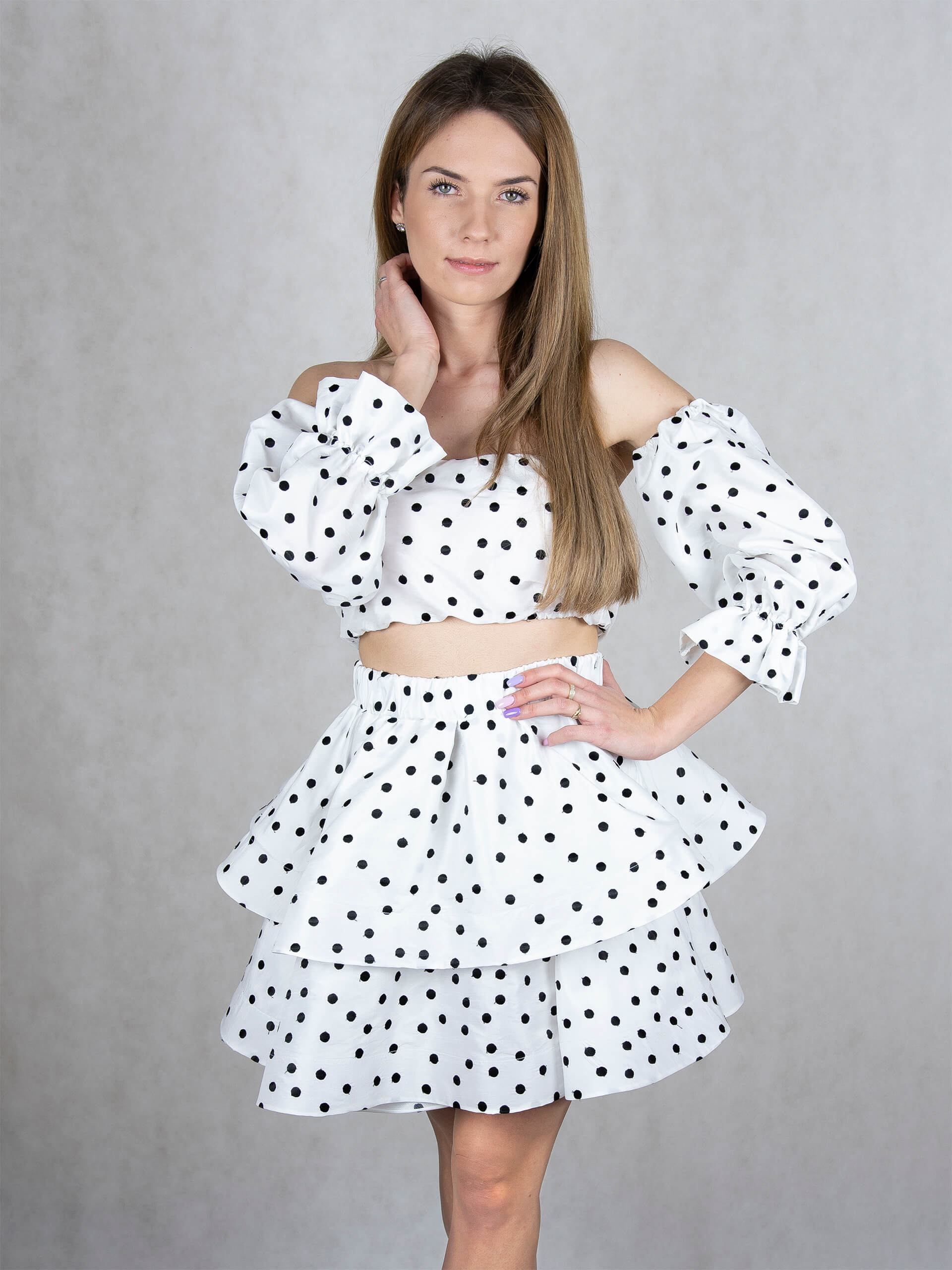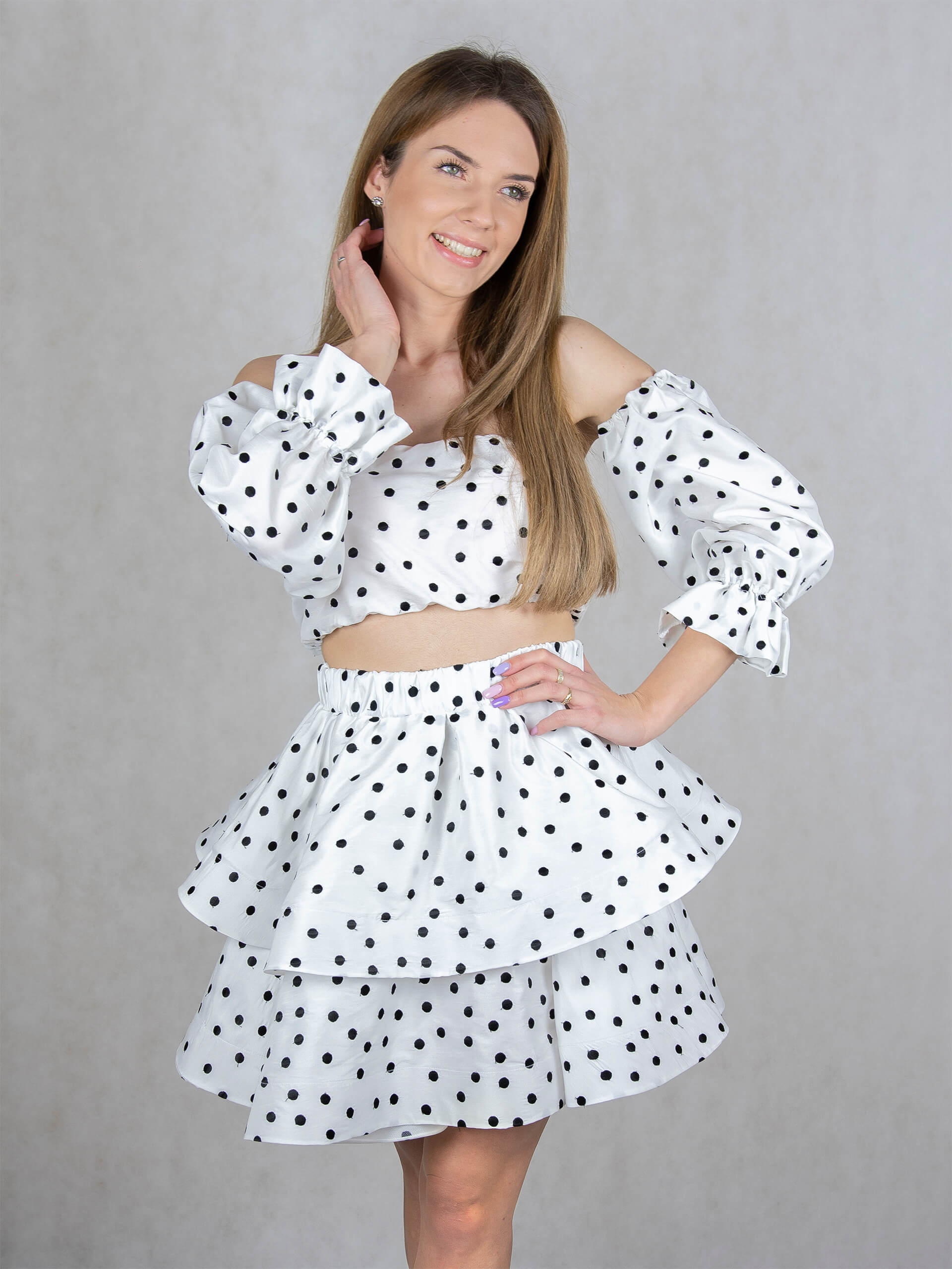 Komplet wykonany z tkaniny o nazwie tafta w haftowane czarne groszki. Składa się z topu, który dopasowuje się do ciała za pomocą wszytej gumki, spódniczki z dwóch falban podszytych krynoliną oraz bufiastych rękawów. Można go nosić na dwa sposoby. Z rękawami lub bez. Idealny na letnie dni. Możemy go stylizować z obuwiem zarówno sportowym jak i eleganckim.